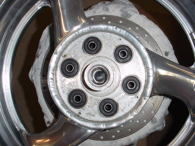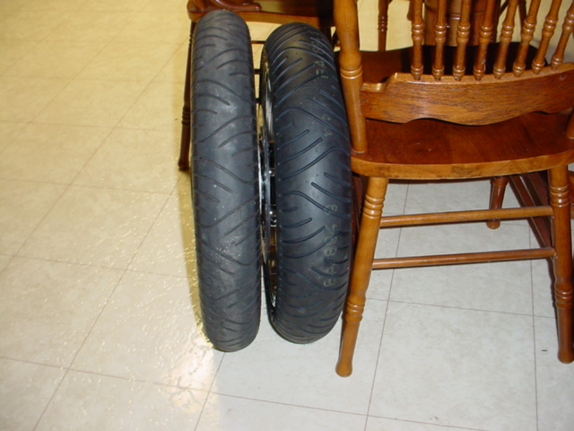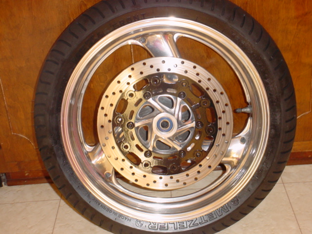 More and more seat time proved this monster had handling issues.. I didn't even know where to start but I did know most of my initial investment would be improving handling. Seemed 17" wheels and radial tires make one of the biggest differences in the way this bike rides. The RMS frame braces I installed had already made a huge improvement in how it managed curves. Started researching 17" rims and didn't really like much until I saw a max with sportbike rims.. My search led me to Rick Leedburg who had a set of matching rims for sale. Rick wanted billet rims for his bike so I purchased the GSXR 1100 rear and 600 Thundercat front from him..