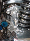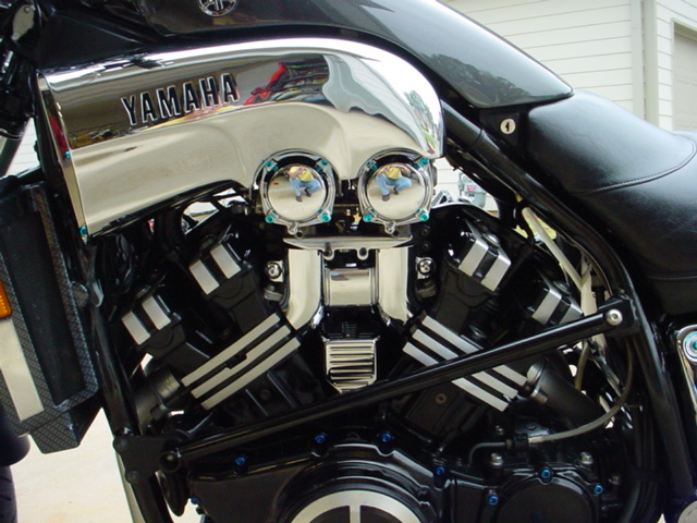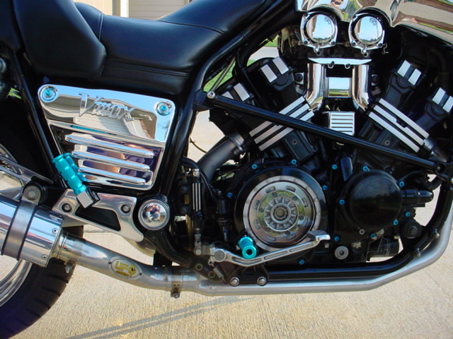Next was to remove those stock foot pegs. Since the R1 calipers have a blue inset, I thought a matching pair of pegs would look nice. Look no further than the Lockhart Phillips catalog which have different colored pegs. Since no Vmax pegs are available, I chose R1 pegs and modified them with a dremmel tool to fit. Also had the carb diaphram covers chromed at Chromemasters.