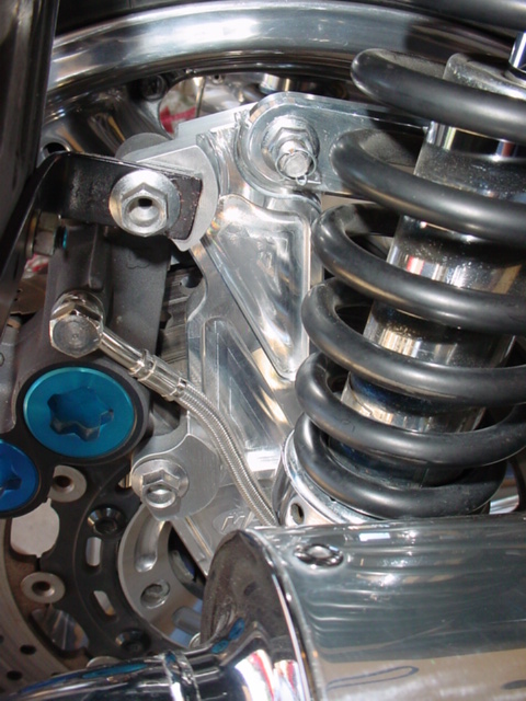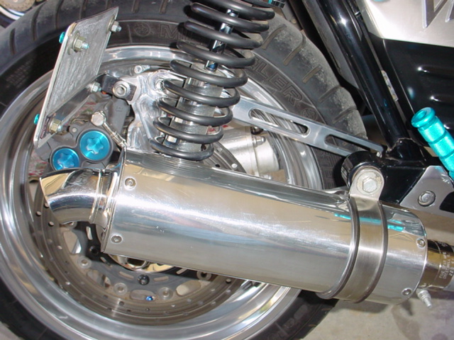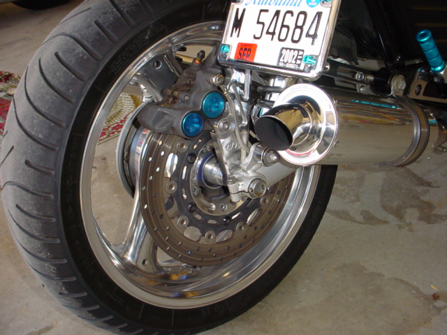 This Vmax was finally getting compliments on looks and had been getting compliments on the sound since the UFO pipes were installed. This is what makes it all worthwhile. Now it's time to get down to details. In my opinion the stock rear rotor is one of the ugliest things I've ever seen.. After repainting the rear rotor, I still wasn't happy with the look or performance. MEK from Germany makes a kit which allows the fitment of a standard front caliper and front semi-floating rotor to the rear. Not only does this improve braking but looks very nice. I found a pair of front R1 low mileage rotors on eBay and another pair of R1 front calipers.