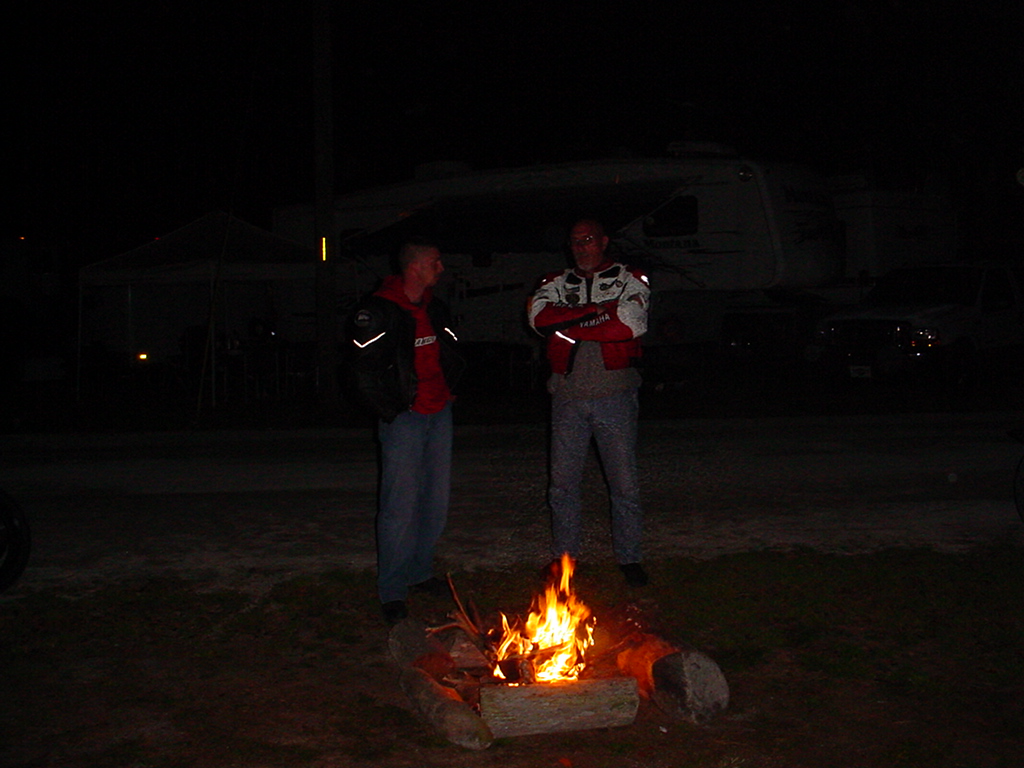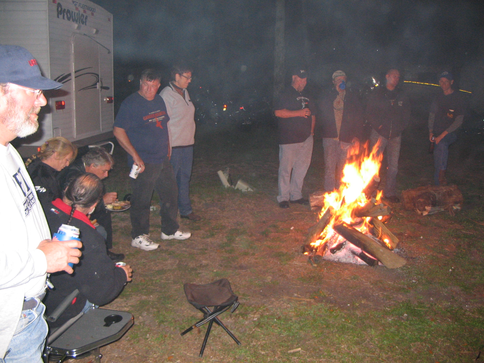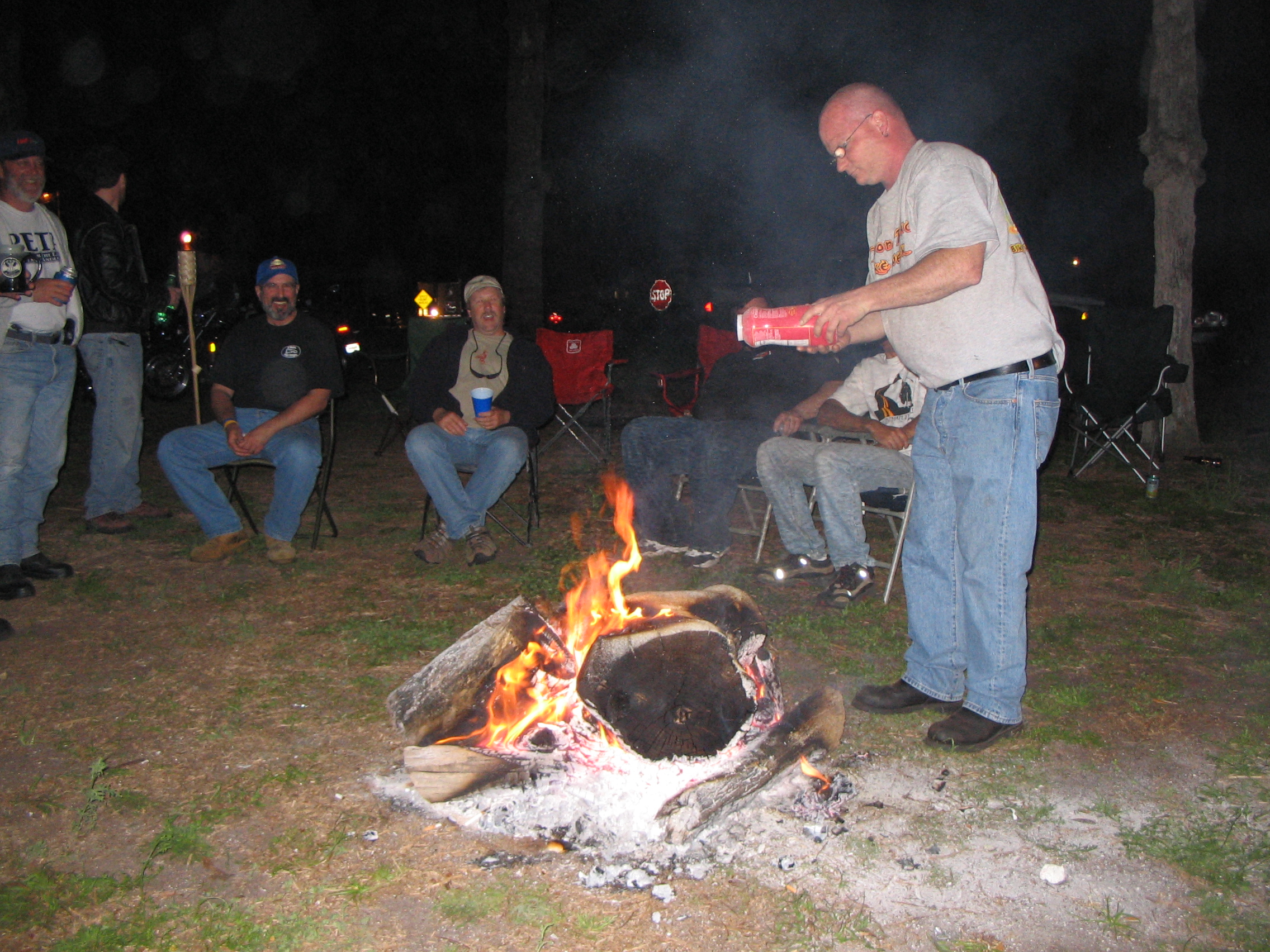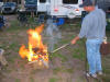 Bill using his flamethrower to light the campfire.
