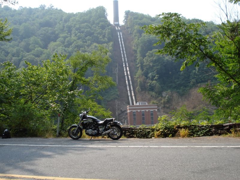 Front view of the Iron Horse. My camp spot out front. Overlook view of Fontana dam from far side. Pumping station below Fontana dam. Current cover pic