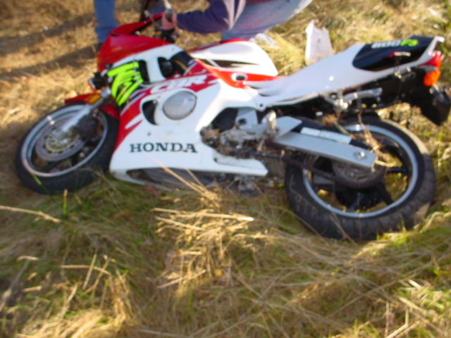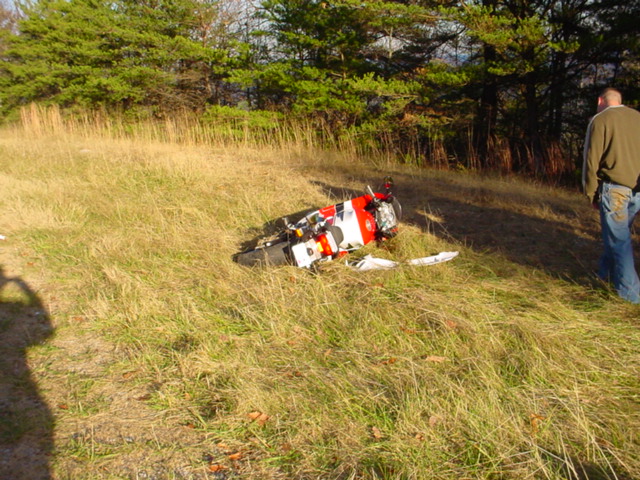 This is what happens when you go too fast in a curve. Happened right in front of us. The rider was wearing only a helmet, jeans and shirt.